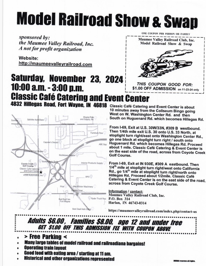| Indiana | Nov 23, 2024 10am - 3pm EST | Ft. Wayne Model Railroad Show & Swap | Classic Cafe Catering and Event Center, 4832 Hillegas Rd., Ft. Wayne, IN 46818 | Flyer Download |