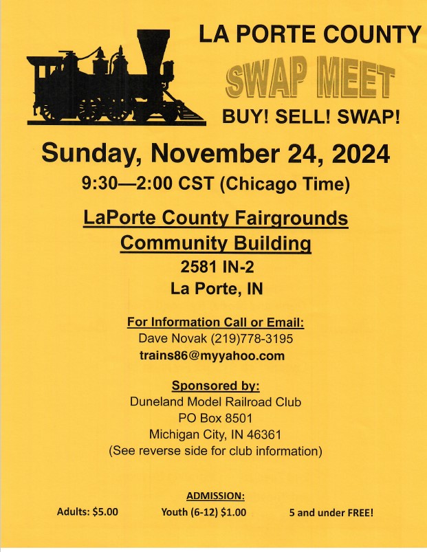 | Indiana | Nov 24, 2024 9:30am - 2:pm CST | La Porte Coiunty Swap Meet | La Porte County Fairgrounds, 2581 IN-2, La Porte, IN 46350 | Flyer Download |