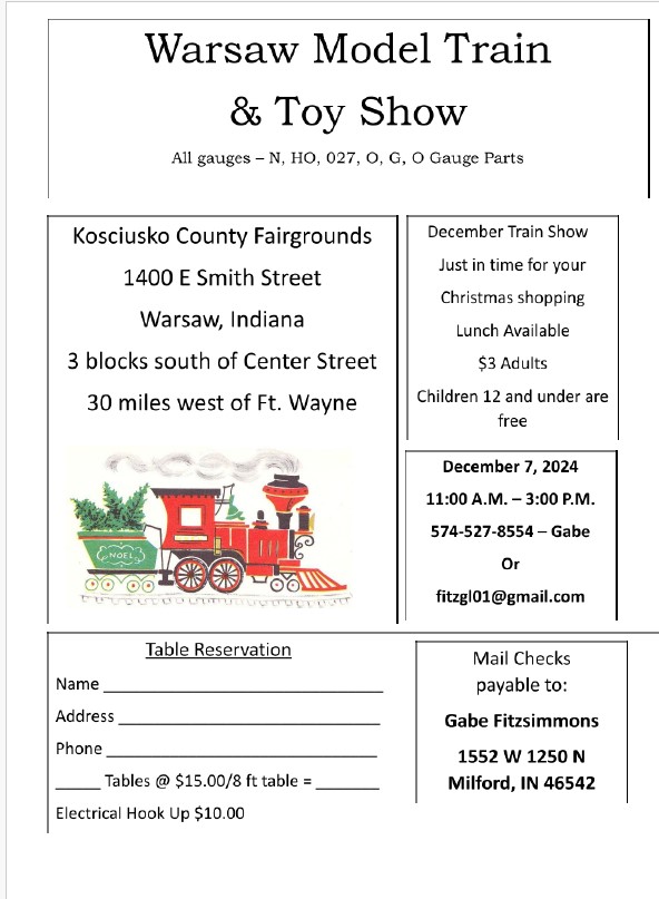 | Indiana | Dec 7, 2024 11AM - 3pm EST | Warsaw Model Train and Toy Show | Kosciusko County Fairgrounds, 1400 E Smith Street, Warsaw, IN 46580 | Flyer Download |